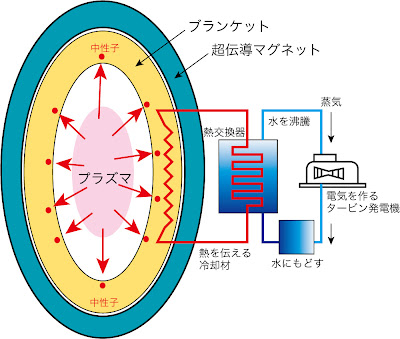 ☆火力発電や原子力発電では燃焼している燃料から直接熱が発生し、熱を取り出すことができます。ところが核融合炉ではまず、核融合反応でできた高速で飛び出してくる素粒子、つまり中性子を周りを覆った厚さ1mのブランケットと呼ばれる部分で受け止めます。ブランケットで受け止められた中性子は速度を落とし、その落ちた速度に相当するエネルギーが熱に変わります。(この時のプランケットの温度は500度ぐらい)この中性子の運動エネルギーが熱エネルギーに変わるところが従来の発電と異なる点です。